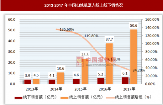 互联网平台发展迅速,以线上为主导的新渠道模式也大为促进了扫地机器人销售的爆发。2017年国内扫地机器人高达89%的销售来自线上渠道,线上零售额为50亿元。