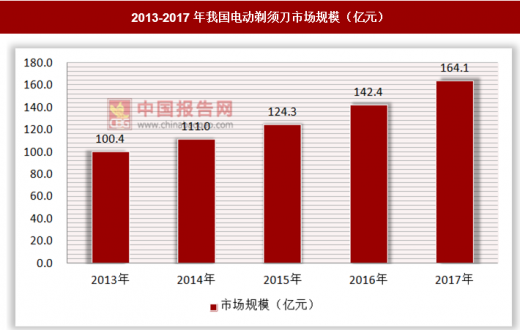 2017年,我国剃须刀市场总规模达到164亿元,同比增长率为15.2%,近几年剃须刀市场规模保持了较高的增长速度。