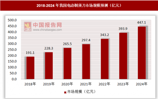 由于未来品牌价值提升带来的单价提升,以及国内广大三四线城市的电动剃须刀高频使用的普及,预计未来我国电动剃须刀市场规模将持续走高,预计到2024年,电动剃须刀市场规模将达到447亿元。
