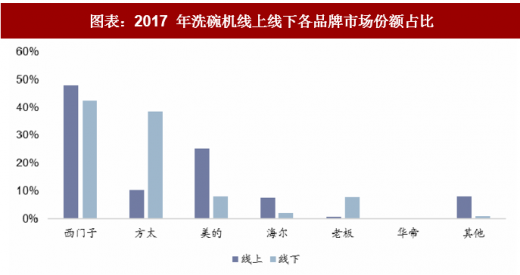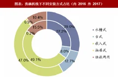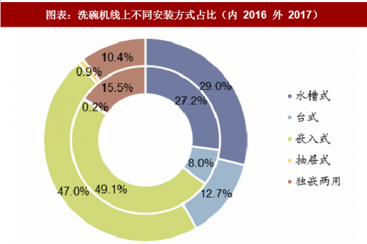 台式与嵌入式机型为主导,水槽式线下迅速抢占份额。目前各结构机型线下以嵌入式为主题,2017 年占比 47%,同时水槽式机型在线下快速占领市场,已达 29%占比。而线上产品中嵌入式与台式机型合占 71.3%,稳定占据主导。而独嵌两用机型定位不明确,因大多家庭洗碗机为固定安装,没有两用的需求,线上线下占比下滑明显。