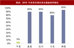 中国净水器市场渗透率处于低位,市场空间宽广。相对于欧美日韩市场净水器渗透率至少 80%以上,中国 2016 年渗透率仅为 5%。净水器作为有从可选消费品向必需品转变的品类,在中国目前水质远落后于发达国家的前提下,可以确定净水器市场潜在空间极为宽广。