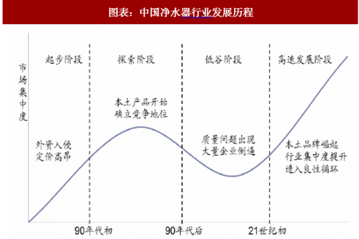 中国净水器行业历经阵痛,现已步入高速增长阶段。中国净水器市场早在上世纪八九十年代就有外资品牌入场,初始定价高昂,随后本土产品通过模仿进而确立竞争关系,初期市场鱼龙混杂。在 90 年代末期产业爆发质量问题,经历洗牌后大量企业倒闭。最终产业标准规范后本土品牌才开始进入良性高速增长。