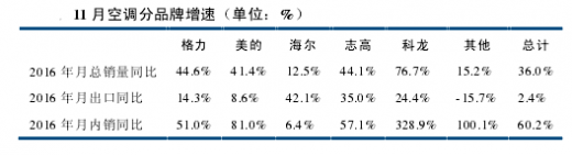 11 月空调板块,格力依旧市场占比第一。从单月增速来看,各品牌均实现了内销的复苏,尤其以格力、美的等龙头为代表的内销增长强劲,2017 年内销增速或值得期待。