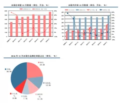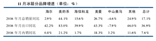 2016 年 11 月,冰箱生产 598 万台,同比增 20.4%,销售 571 万台,同比增 17.1%。其中,内销出货 355 万台,出口 316 万台,同比分别增长 7.6%和 36.7%。