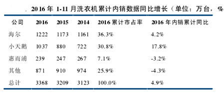 2016 年 1-11 月,累计内销前三中仅惠而浦同比下滑,洗衣机作为白电中唯一内销增长的子品类,小天鹅作为龙头的推动作用显著。