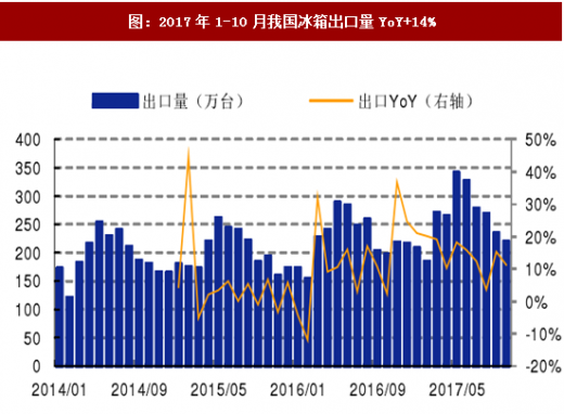 冰箱内销需求有所恢复。参照空调与地产的滞后和关联关系,我们得出结论,冰箱也滞后于新房销售大约5个季度,新房引致的冰箱需求约可贡献冰箱内需的20%}30%。依照地产销售增速领先冰箱的趋势进行预判,我们认为冰箱的内销增速将从2017年6月开始得到改善,事实也得到验证。从6月开始,冰箱内销出货量增速降幅逐步收窄,到9月同比涨幅一0.9%;10月单月内销量yoy 4%,恢复增长。我们认为,冰箱虽然普及率高,接近饱和,但自家电下乡以来的需求透支正逐步修复,随着更新换代需求的增加,冰箱销量也有望恢复平稳增长态势。