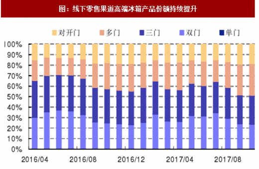 冰箱的市场的消费升级趋势明显。根据中怡康数据,2017年1-10月,代表高端产品的对开门、多门冰箱市场份额分别为16.5%,24.7%,同比分别提高2.1pct,5.7pct。以更新为主的需求将利好高端品牌,且冰箱行业的竞争格局也还有改善空间。