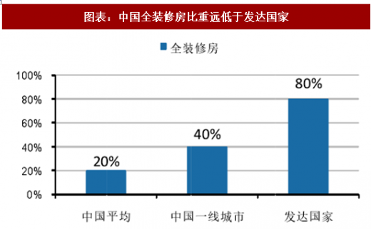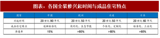 而我国住宅全装修的历史较短,全装修住宅在我国住宅总量中的占比较低,目前全装修住房渗透率仅为20%,与发达国家80%的比例相差甚远,尤其是日本,在住宅产业化的推动下,实现了住宅全装修的工业化,日本目前的全装修渗透率基本已经达到了100%。而即便是上海、深圳、北京这类一线城市,全装修住宅渗透率也仅为30%-40%,未来提升空间巨大。