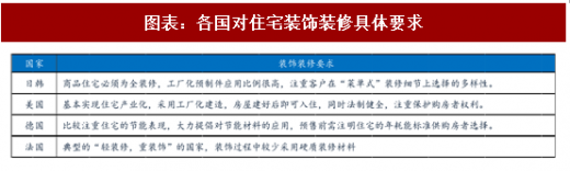 在国外,多数发达国家注重住宅标准、节能,目前已不再销售毛坯房。从韩国、日本、美国、法国、德国等主要发达国家住宅装饰装修发展路径来看,由于环保、节能、减排、成本等方面的原因,除德国市场上仍有少量毛坯房出售外,其他国家已经不再允许毛坯房销售,并同时在装修及验收标准、节能材料应用、施工合同细则和纠纷解决机制等方面均做了极为详细的规定。