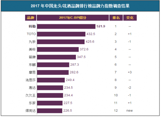 2017年中国龙头/花洒品牌排行榜品牌力指数调查结果