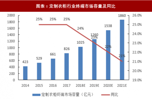 经过近 20 余年的发展,定制和定制行业均呈现高速增长的发展状态,历年增速不低于 20%。2017 年,定制橱柜终端市场容量达到 1108 亿元,同比增长 21.9%;定制衣柜终端市场容量达到 826 亿元,同比增长 25.0%。同时,定制橱柜和定制衣柜行业渗透率不断提升,2017 年,定制橱柜行业渗透率达到 60%,定制衣柜行业渗透率约为30%。对比西方国家定制家具 70%左右的渗透率,我国的定制家具行业依然较大的渗透空间。