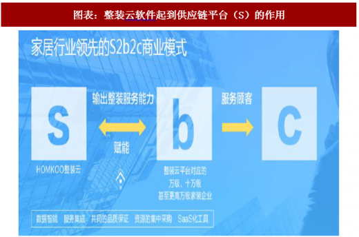 定制家具现阶段主要采取的形式是 o2o c2b 形式,即“线上引流→线下体验”、“客户个性化需求→渠道→厂商组织生产”的过程。家装行业现阶段仍以线下为主,2014 年开始爆发 o2o 和 f2c 热潮。而定制家具新兴起的整装大家居类是一种新型模式——s2b2c(赋能类),即在一个强大的数据化供应链平台(s)的控制下,能够使得众多的小厂商(b)以更低成本与消费者(c)进行更有效率的交互。通俗地说,c2b、f2c 的本质是先建立了端对端之间的高速通路,而 s2b 则是建立了以 s 为中心并打通全部高速通路的。s2b2c 通过借助 s 对众多小 b 赋能,是一种从多个厂商传导到消费者的高效价值链,本质是全网络端对端去中介化和 s 中心化。但是 s2b2c 模式创建难度极高,目前发展尚不成熟。