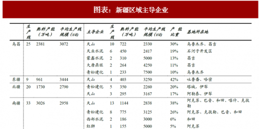 ——天山股份是中建材旗下子公司,北疆是其大本营,自2001年开始将发展战略南移,以时间、区域分布式推进产能扩容,其产能涉足新疆全域,产能占比32%,位列新疆第一,在各区域保持规模领先地位。