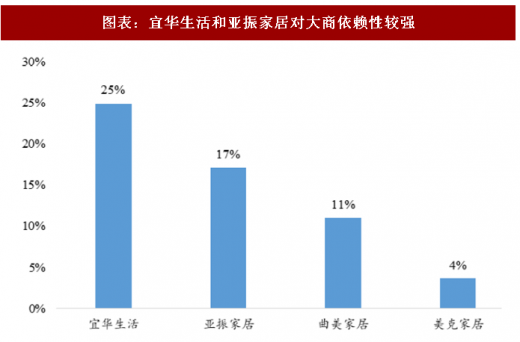 宜华生活和亚振家居销售更加依赖大商。从公布的 2017 年成品家具前五大客户收入占比的情况看,宜华生活前五大客户占比达到 25%,亚振 家居次之,美克家居则仅有 4%,说明宜华生活和亚振家居对于大商的依 赖性更强。