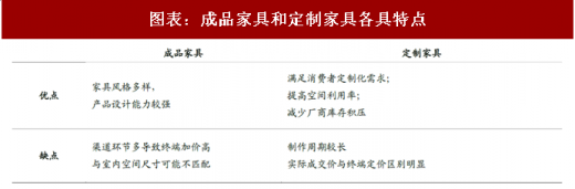 定制家具和成品家具各有优劣。近几年定制家具高速发展,充分满足消 费者的个性化设计以及提升空间使用率的需求;成品家具在装饰风格、产品设计等方面也具备自己的优势,部分品牌通过品类扩张、渠道下沉 等方式也实现加速增长,并有望实现集中度的不断提升。