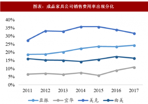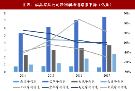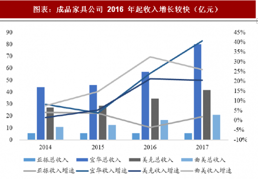 分公司看,成品家具公司收入总体自 2016 年起实现加速增长。自 2016 年起,成品家具公司收入增速均在 20%左右,曲美家居更是超过 30%, 其主要原因为渠道扩张、价格带下沉以及从部分企业从成品到定制的延 伸。从净利润的角度分析,由于单位成本的上升,成品家具公司净利润 增速略微下降,其中,美克家居由于成本和费用控制实现平稳增长,同 时曲美家居也由于费用率的降低,其 2017 年净利润增速超过收入增速。