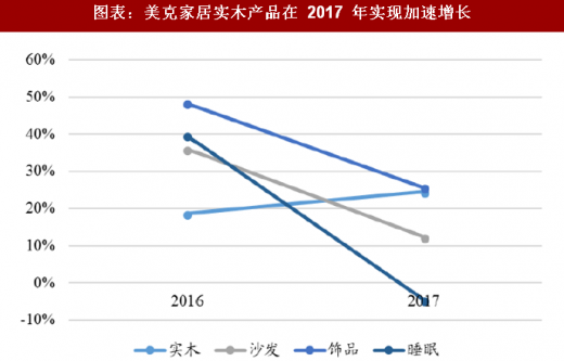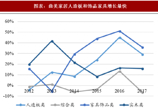 分板块比较,人造板、实木和饰品家具增长更为迅速。从美克家居和曲 美家居的细分业务增长情况来看,实木家具、饰品近三年始终保持 增长势头,2017 年增速分别为 20%和 30%左右。而曲美家居的人造板主要针对其定制产品,近三年收入复合增速达 33%,体现出家具公司板块的高速增长。