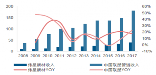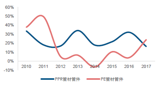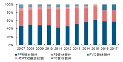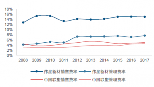 过去几年伟星新材先开启渠道变革,通过采取“零售工程并举,零售为先” 的经营策略,打造扁平化渠道,通过销售分公司和办事处来管理经销商。而中国联塑负责管理一级经销商,采用了标准化管理模式,但不参与管理二级及以下层级的经销商,与伟星新材相比其销售费率和管理费率均较低。形成差异化产品结构的重要因素之一就是差异化的经营策略和商业模式。数据显示,2017 年中国联塑管道收入在 181 亿元左右,其中 pvc 收入 118 亿元、ppr 和 pe 收入 63 亿元;伟星新材管道收入约在38 亿元左右,其中 pvc 收入 5 亿元、ppr 和 pe 收入 33 亿元。