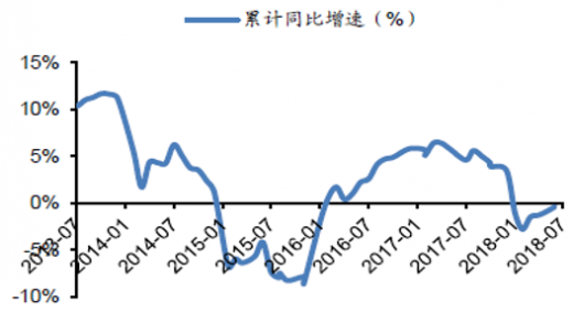 据国家统计局数据,2018 年1-7月全国产量11.9亿吨,比2017年同期下降0.3%;累计产量5.0亿重箱,比2017年同期同比下降0.4%。由此可见,我国水泥和玻璃产量增速呈现“弱波动”态势。