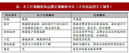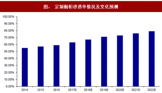 与手工打制橱柜相比,定制橱柜在设计工艺和厨电配套上有很强的优势,能做到厨房整体性的合理运用和厨电配套,为消费者节省了大量时间。随着快节奏的生活和对时尚设计的追求,品牌定制橱柜渗透率不断提升。