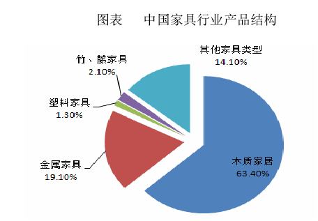从产品结构来看,木质家具仍是我国最重要的家具类型。按产值计算,2014年我国木质家具总产值达到4,556.81亿元,占国内家具总产值的63.4%。其次是金属家具,占当年国内家具总产值的19.1%。