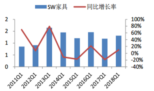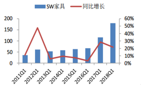 根据数据显示,2018年一季度我国家具板块增速较去年小幅放缓,收入 179.87 亿,同比增长 21.62%;归母净利润10.56亿,同比增加11.92%。