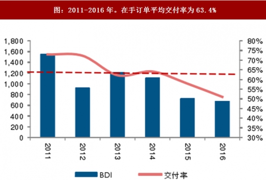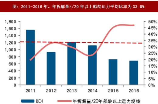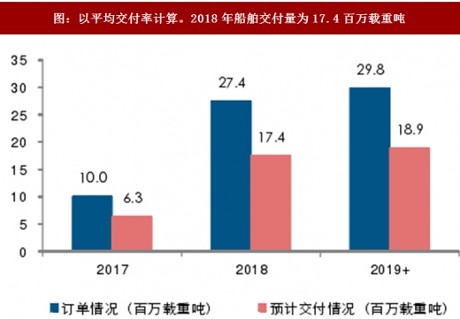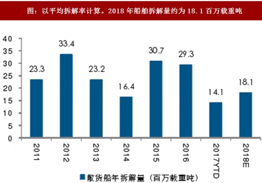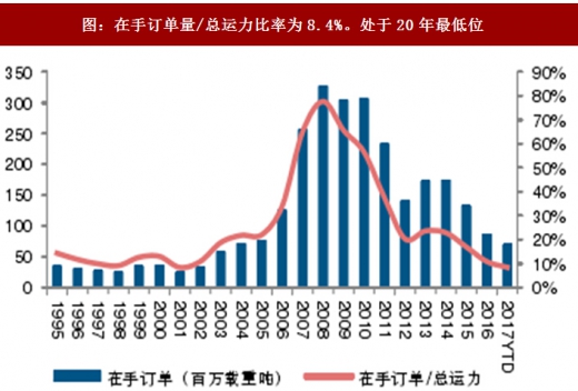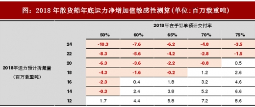 2018年或将成为200年以来散运行业去产能的第一年。随着散运新船在手订单近几年来逐渐交付,同时新缔结订单量补充不足,导致行业在手订单量快速减少:截止2017年11月底,行业拥有在手订单量68.8百万载重吨,在手订单量/总运力比率为8.4%,该比率处于近20年来最低位。在手订单量是决定行业中期运力供给的核心变量,由于目前在手订单量/总运力比率处于历史低位,或将导致2018年干散货船年底运力规模低于年初运力规模一一行业真正进人“去产能”阶段:以历史平均订单交付率和拆解率计算,2018年将交付和拆解散运船舶分别为17.4和18.1百万载重吨(拆解量大于交付量),预示2018年行业运为净增加量或将小干o。