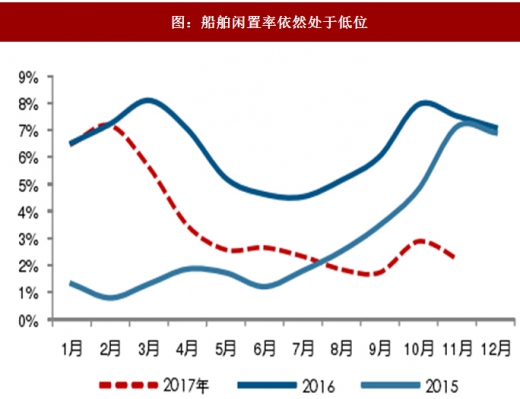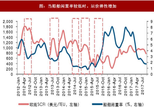 船舶闲置率仍处低位,运力“库存”较低,运价弹性依旧。截止2017年11月底,集运行业船舶闲置率为2.25%,明显低于前两年(2015年和2016年)的同期水平。我们认为,船舶闲置率类似劳动力市场的失业率,是集运市场短期景气度的重要表征—较低的船舶闲置率或意味着行业供需关系已较前两年明显改善。同时,回顾历史,当船舶闲置率处于低位时,运价向上弹性增强。我们认为,目前集运行业较低的船舶闲置率或将缓解2018年供给压力一一闲置运力后续回归市场的规模有所减少,运价向上弹性依旧。