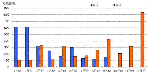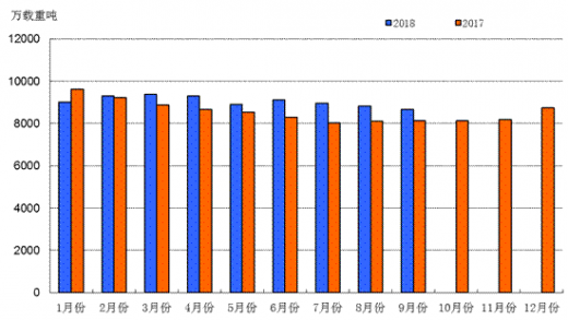 船舶行业产业集中度进一步提高,全国前10家企业造船完工量占全国58.3%,比2016年提高1.4个百分点。根据数据显示,2017年,全国造船完工4268万载重吨,同比增长20.9%;承接新船订单3373万载重吨,同比增长60.1%;2017年12月底,手持船舶订单8723万载重吨,同比下降12.4%。2017年,造船完工量、新船订单量和手持订单量在全球市场所占份额分别为41.9%、45.5%和44.6%,我国三大造船指标国际市场份额均位居世界第一。2018年1~9月份,我国造船完工量同比下降,新承接和手持船舶订单保持增长。数据显示,2018年1~9月份,全国造船完工2751万载重吨,同比下降21.7%。承接新船订单2682万载重吨,同比增长33.2%。9月底,手持船舶订单8654万载重吨,同比增长6.5%,比2017年底下降0.8%。