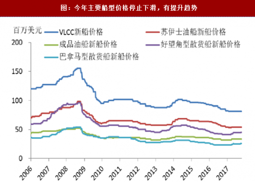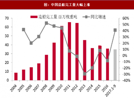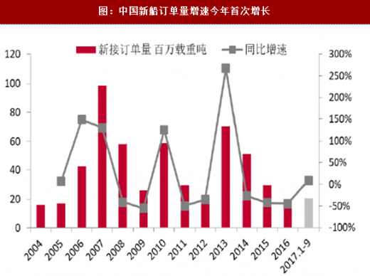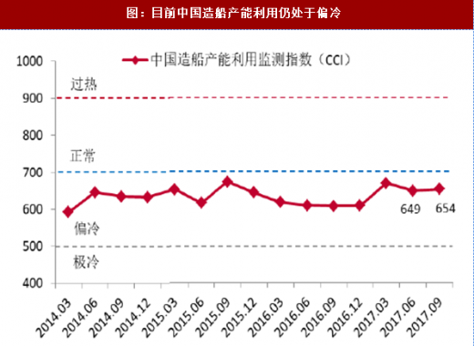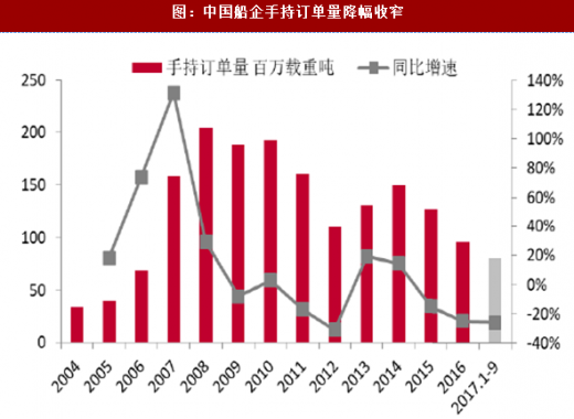 造船行业总体产能利用仍处于偏冷水平,盈利能力有待提高。2017年1~9月份,船舶行业80家重点监测企业完成工业总产值2843.5亿元,同比下降6.9%。其中船舶制造产值1228亿元,同比下降11.6%;船舶配套产值184亿元,同比下降9.7%。主要受到2015-2016年较低船价的影响。