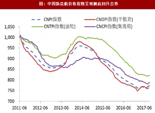 新造船价格也呈现触底回升的态势。9月30日发布的中国新造船价格指数cnpi报765点,在八月微弱反弹1点后,本月再向上攀升了5点,相当于0.7%的涨幅。三大船型的综合指数全面上扬:干散货船综合指数cndpi上涨0.8%至774点;油轮综合指数cntpi上涨0.5%至822点,集装箱船综合指数cncpi上升0.8%至788点。