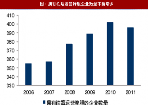 此外铁路民营化允许私人资本注入该行业,从而增加竞争性。据统计,2010年底,拥有铁路运营牌照的企业达到402家,真正活跃在铁路运营市场的约有250家。其中有100家左右提供短途运输服务,超过10家提供长途运输服务,大致140家提供铁路货运服务或其他运输服务。