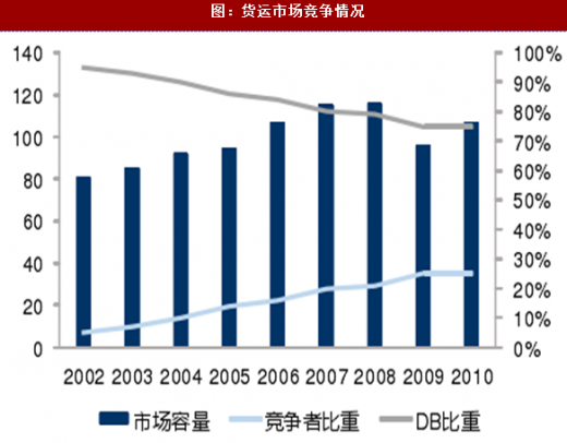 铁路货运市场竞争也较为激烈,竞争者在铁路货运市场中的份额比重增长速度较快从2002年的5%上升至2010年的25%。