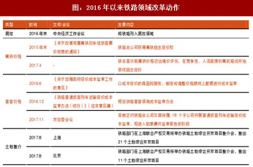 能够明显地感觉到,铁路总公司不论在改革亦或是自身现金流上,都承受着巨大的压力,十三五、铁路改革目标中共同指向的资产证券化目标,其重中之重都是自身现金流与盈利能力的改善,这也是2017年中,高铁提价、土地开发探索均加速的原因。将在后文中的板块策略内,详细以量化指标阐述铁总的改革压力与进程。