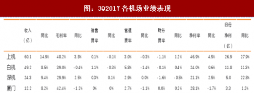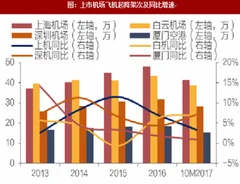 不同机场位于发达程度不同的城市,具备不同规格的硬件设施,制定不同的远期规划,业绩的驱动变量差异明显,投资机会往往自下而上产生。由于硬件保障能力接近瓶颈,空域资源限制,2017年前10个月,我国a股上市机场业务量增速总体并不算快,从起降架次的角度看,增速最高的深圳机场达到7.1%,增速最低的厦门空港仅为0.9%,但随着枢纽机场供需关系紧张导致客座率攀升,且国际线占比提高,航司投放宽体机比重加大,旅客吞吐量增速明显高于起降架次增速,其中白云机场增速最高,达到9.9%,而上海机场最慢,为5.9%。