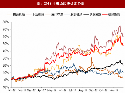 2017年机场行业股价主要驱动力在于免税商业招标大超预期提高远期业绩空间,3月首都机场免税招标、4月白云机场进境免税招标点燃热情,此后白云机场t2商业招商屡超预期,拉动股价持续上行,截至2017年12月1日,机场行业指数年内涨幅达到48.1%,远远跑赢同期沪深300指数20.8%的涨幅,个股方面,枢纽机场涨幅巨大,上海机场涨幅达到60.5%,白云机场紧随其后,涨幅47.4%,深圳机场、厦门空港涨幅为10.8%、2.8%。
