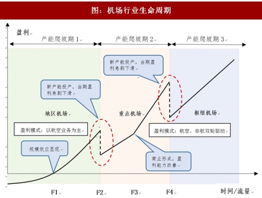 机场行业的生命周期也可以分为成长初期、中期、后期三个阶段,每个阶段贡献收益的主要业务不同,规模效应对于利润的贡献程度也不同。机场成长初期以航空业务为主,规模效应尚不明显;中期航空业务规模效应明显并开始盈利,非航业务开始贡献收益;后期,航空业务与非航业务并重,非航业务成为主要利润来源。