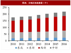 自2010年起,我国的机场数量持续攀升,从2010年的175个上升至2016年底的 218 个,年复合增长率为 3.7%。从不同区域看,东北、东、西、中部 2016 年机场数量占比分别为10.5%、24.3%、50.5%、14.7%。与2010年相比,东北地区的机场数量由19个上升到了23个;东部地区的机场数量由46个上升到了53个;西部地区的机场数目上升幅度最大,从2010年的85个增长至2016年的110个;中部地区由25个增长至32个。西部地区机场存量与增量在所有地区中最高的原因在于西部地区纵深辽远、各省份地域广大,陆路交通网密度小建设难度大,因而给机场的发展留下了较大的空间;同时,随着西部地区经济的增长、业的发展以及“一带一路”政策的利好,西部地区客流量加大也推动了机场的发展。而东部地区相对机场数量饱和,并且其他交通方式(诸如)发展较完善,推动了客运机场集中化的发展趋势。