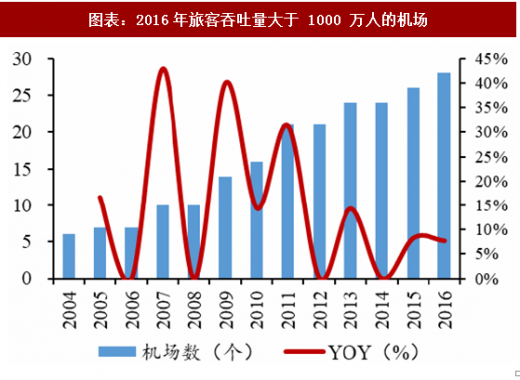 从机场规模上看,2016年旅客吞吐量超过1000万人次的机场数量快速上升,2004-2016 年此类机场的数量由6个上升到28个,年复合增长率为13.7%;增长呈现明显的周期性,也印证了机场新产能投产的规律。