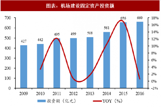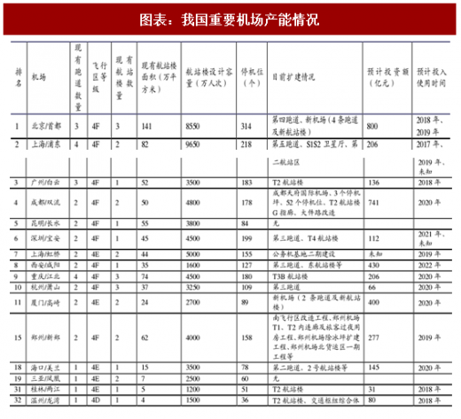 从固定资产投资上看,2009-2016 年机场建设固定资产投资额逐步走高,近 5 年年复合增长率为5.9%。经济危机造成投资额基数缩小,2010年政府扩张性经济政策推动机场建设投资额大幅上涨,机场建设固定资产投资额增速于2011年达到了第一个高峰;随后几年固定资产投资额增长放缓,又在2015年随着我国宏观经济的复苏出现了第二个增长高峰。下表中展示了我国主要机场的现阶段产能情况以及未来投资规划。上海浦东国际机场的新跑道将于明年前半年投入使用外,剩余机场的扩建资产多数将于2020年前后释放。