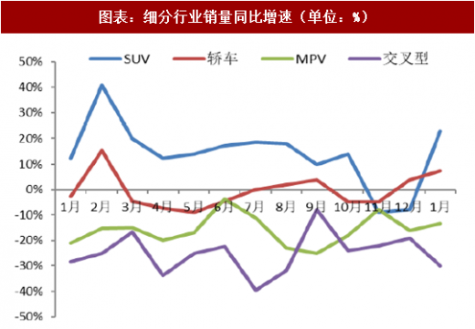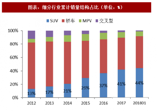 细分领域中,suv 销量保持较高的正增长(yoy 23.0%),其他领域同比增速表现较弱,销量结构中 suv 占比达到 44%。根据中汽协统计数据:2018 年 1 月 suv 销售 108.3 万辆,同比增长 23.0%,环比下降 7.7%;轿车销售 115.9 万辆,同比增长 7.3%,环比下降 3.4%;mpv 销售 17.9 万辆,同比下降 13.4%,环比下降 21.7%。