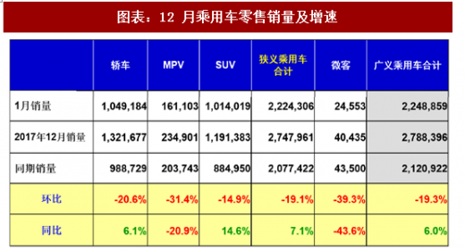 1 月乘用车销量同比增长 10.7%。根据中汽协统计数据:2018 年 1 月乘用车销售 245.6 万辆,同比增长 10.7%,环比下降 7.4%。