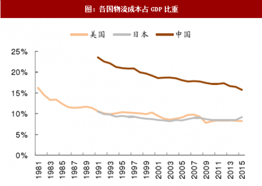我国的物流成本占gdp比重为14.6%,与美国的7.2%相比较高,与全球平均水平11.7%相比仍然较高,其中管理费用份额中国明显比国际高(中国1.8%vs美国0.2%/日本0.3%)。