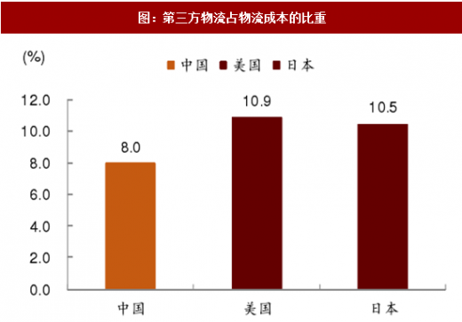 在中国,19%的原材料运输是由第三方物流提供、18%的成品销售物流是第三方物流负责,而美国第三方物流的渗透率是58%,日本为80%。另一方面中国第三方物流占物流成本的比重也远小于美国、日本(中国8%vs美国10.9%/日本10.5%,中国第三方物流效率仍有待提高)。
