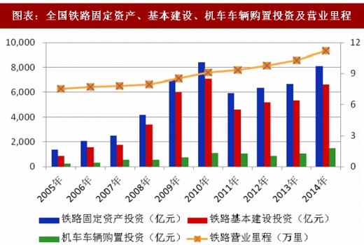 截至 2016 年末,我国铁路营业里程已达 12.4 万公里,当年旅客发送量 281,405 万人,货运发送总量 333,186 万吨,运输效率居世界前列。截至 2016 年末,全国铁路固定资产投资完成8,015亿元,投产新线3,281公里,其中高速铁路1,903公里。