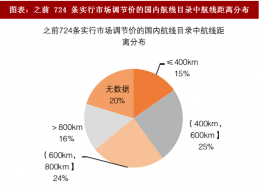 本次新增的 306 条执行市场调节价的国内航线,可以说放开的力度更大,根据我们的统计,本次放开的 306 条航线中有 304 条航线里程超过 800km,包括高客流、高收入的北京-上海,北京-深圳,广州-北京,广州-上海航线,市场化力度超预期,并且高铁对此类长距离航线的替代不明显。而之前的 724 条航线中,除去搜集不到数据的 20%的航线,其余小于 400km 的航线占 15%,400km-600km 的航线占 25%,600-800km 的航线占 24%,大于 800km 的航线占 16%,可以看出,之前放开的航线中短航线较多,涉及支线较多,但真正涉及的旅客并不多,并且部分与线路重合。