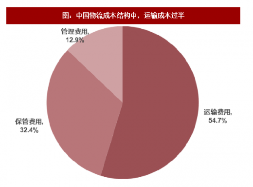 图:中国物流成本结构中,运输成本过半