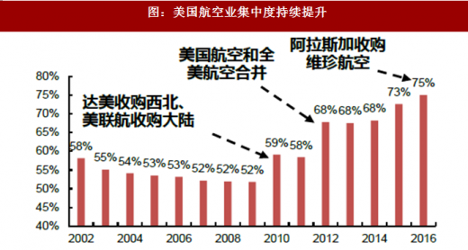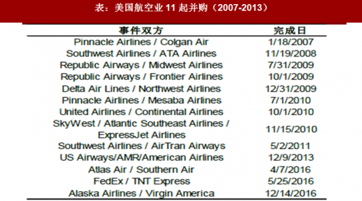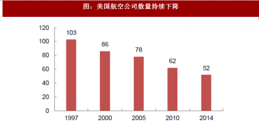 危机后,连续亏损导致大量航空公司破产,同时美国航空业掀起并购潮(2007-2013共11 起并购)。2008 年,达美航空兼并美国西北航空;2010 年美国联合航空与大陆航空合并;2013 年,美国航空与全美航空合并;2016 年,阿拉斯加航空收购维珍航空。在短短16 年之内,美国定期航空公司总数从1997 年的103 家减少到2014 年的52 家。