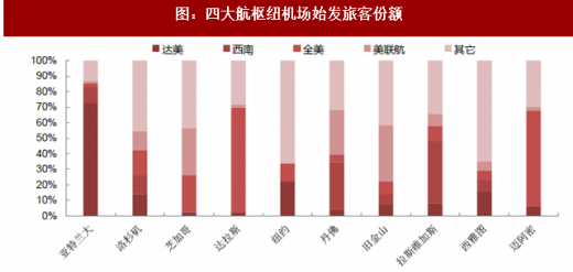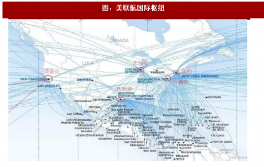 三大航均在国内构建起大型枢纽。以美联航为例,其在美国国内共有纽约(拉瓦克)、华盛顿、旧金山、洛杉矶、休斯顿、芝加哥、丹佛7 大重要枢纽,分别覆盖美国的东西南北中五大区域,其中国际和洲际航线以芝加哥、纽约和休斯顿为核心,分别覆盖亚洲、欧洲和南美三大区域,通过航班波向枢纽转运旅客,再运送至全国及全球各大城市。