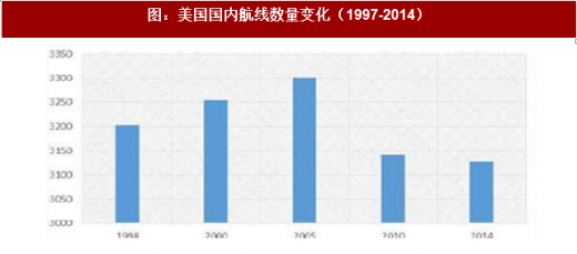 与此同时,美国国内航线数量由1997 年的3203 条增加到2005 年的3302 条后,又减少到了2014 年的3128 条,航线的减少主要是由于航空公司整合后削减亏损航线。